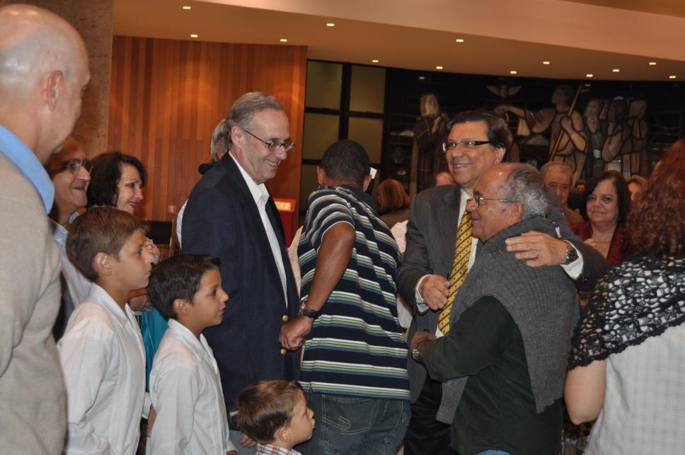 O prof. Augusto Sampaio recebendo cumprimentos em missa pelo seu aniversário na Igreja do Sagrado Coração de Jesus.