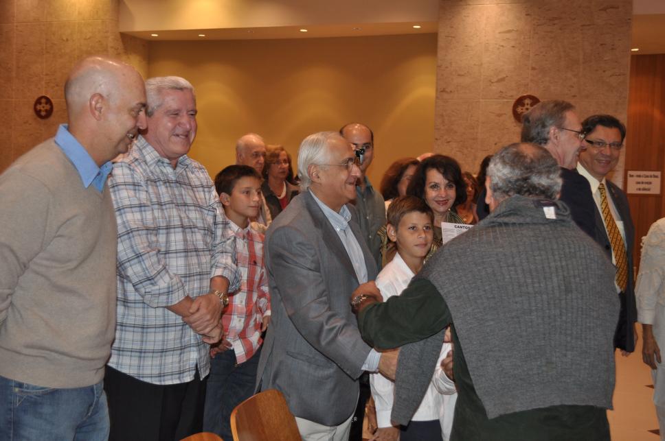 Prof. Augusto Sampaio sendo cumprimentado em missa pelo seu aniversário na Igreja do Sagrado Coração de Jesus.