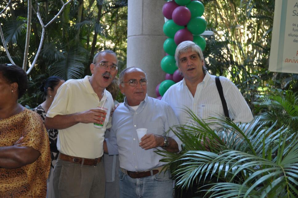 Durante a festa realizada pelo seu aniversário, o Vice-reitor prof. Augusto Sampaio conversa com os professores Reinaldo Calixto e Alfredo Jefferson.