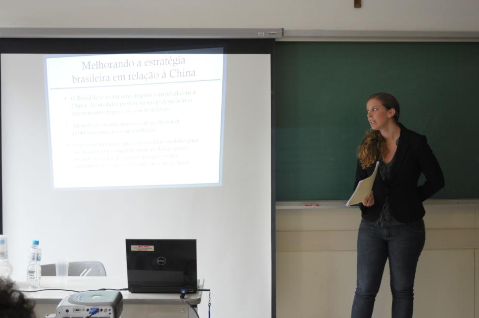 A pesquisadora Dawn Elisabeth Powell, da Comissão Fullbright, ministrando a palestra ''Desmistificando a entrada chinesa no Brasil''.
