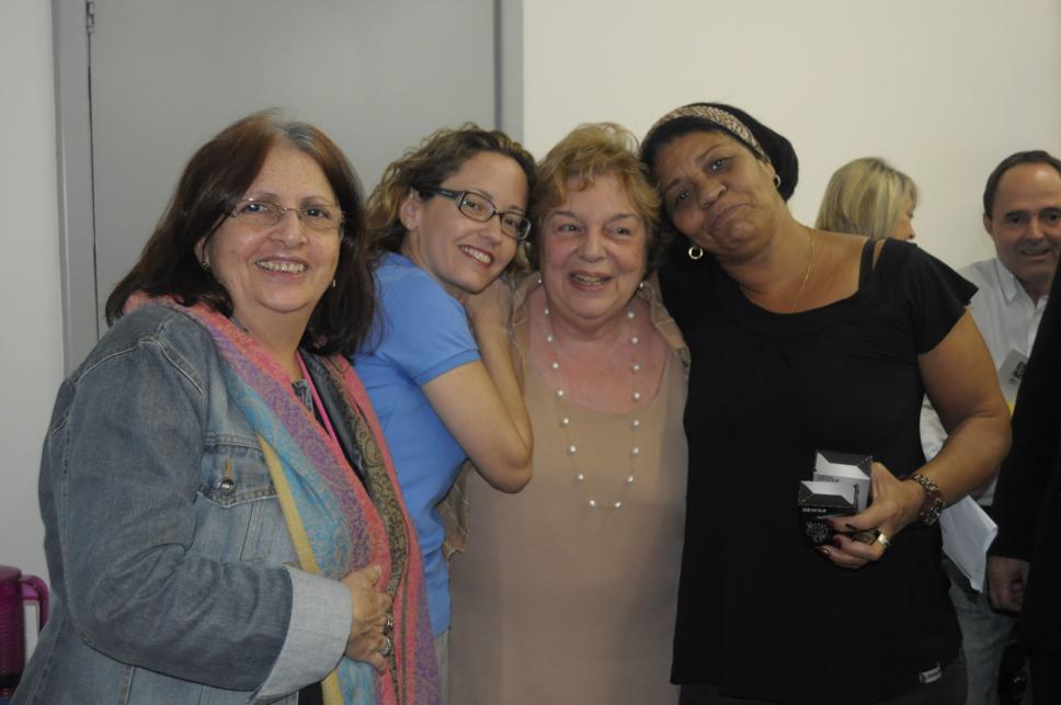 A profa. Margarida de Souza Neves é abraçada por amigas.