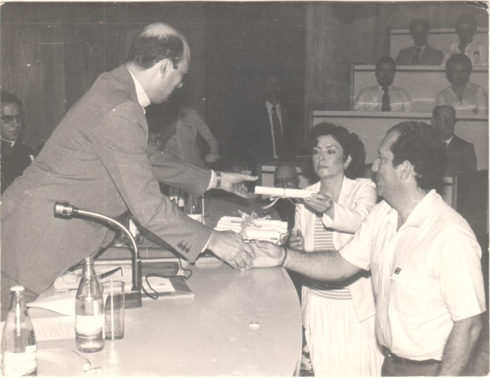 Adalberto Pereira, prefeito do campus da PUC-Rio, recebe, através do reitor Padre MacDowell S.J., a homenagem e o cumprimento da Universidade pelos mais de vinte anos de trabalho dedicados a ela.