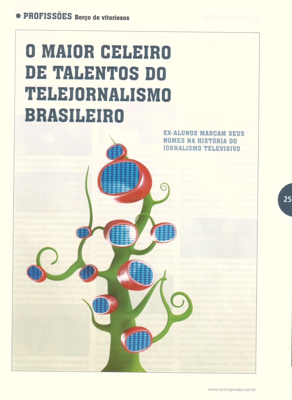 Matéria da Revista PONTES, n°1, sobre o sucesso dos ex-alunos da PUC-Rio no jornalismo televisivo brasileiro. A PUC-Rio, 'O maior celeiro de talentos do telejornalismo brasileiro'. (página 25)