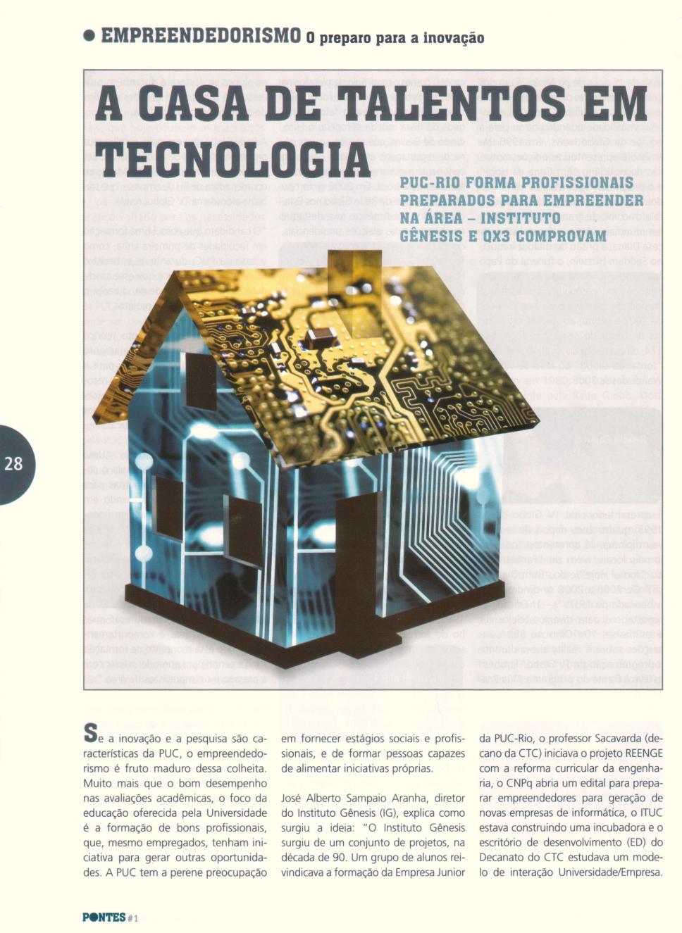 Matéria da Revista PONTES, n°1, sobre o papel da PUC-Rio na formação de empreendedores na área de inovação tecnológica e pesquisa. PUC-Rio, 'A casa de talentos em tecnologia'. (página 28)