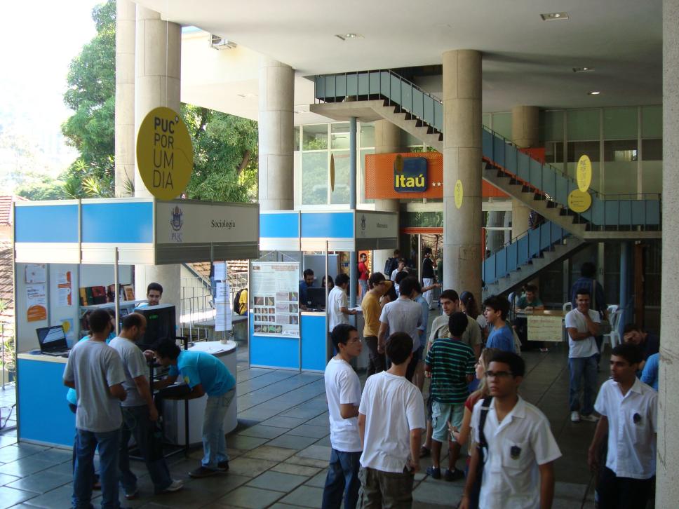 Movimentos do evento 'PUC por um dia' 2010, que recebeu estudantes do Ensino Médio interessados em conhecer melhor essa Universidade e seus cursos. Na imagem aparece o estande de divulgação da Área de Sociologia.