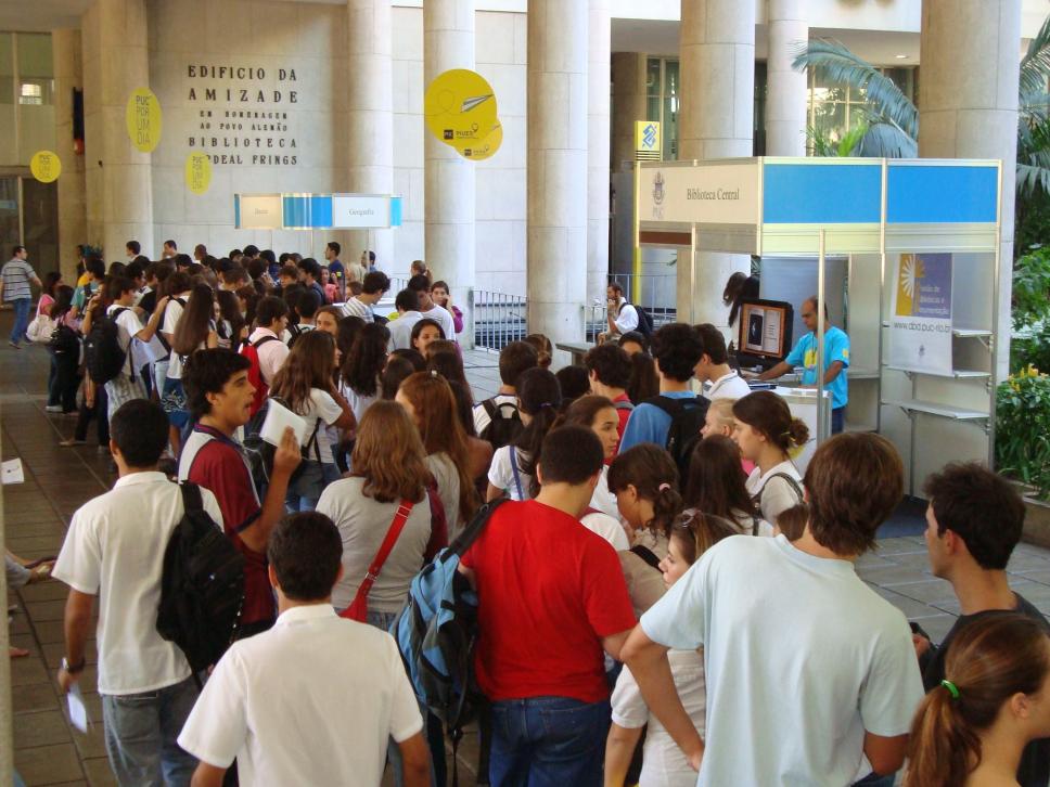 Os estudantes visitantes esperam para conhecer o estande de Direito, durante o evento 'PUC por um dia' 2010, organizado pelo PIUES da PUC-Rio.