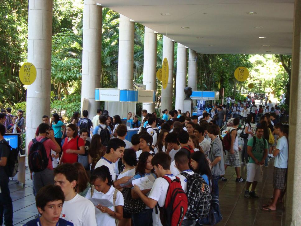 Os estudantes visitantes esperam para conhecer o estande de Direito, durante o evento 'PUC por um dia' 2010, organizado pelo PIUES da PUC-Rio.