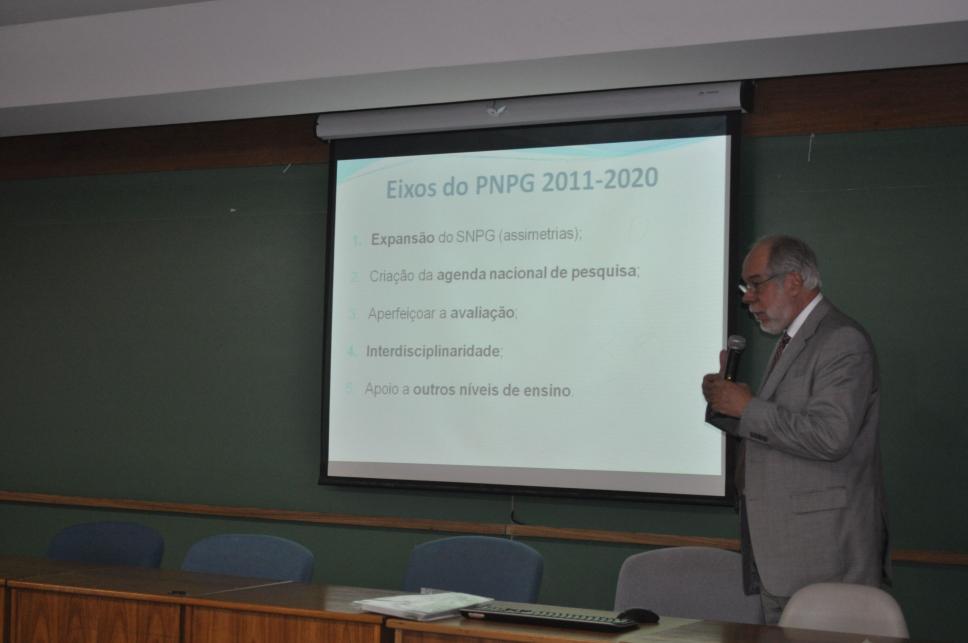 O presidente da CAPES, Professor Jorge Guimarães, apresenta o Plano Nacional de Pós-Graduação 2011-2020 a representantes da administração central e outros professores da PUC-Rio. Ele destaca os eixos desse programa, como a expansão do SNPG, a criação da agenda nacional de pesquisa, o aperfeiçoamento da avaliação, a interdisciplinaridade e o apoio a outros níveis de ensino.