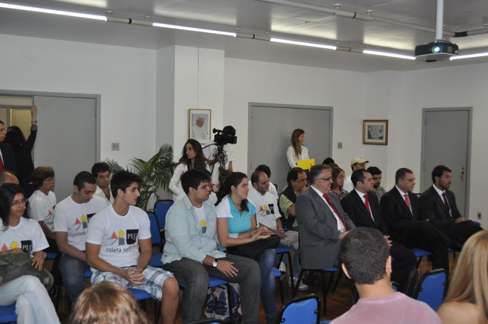 Representantes do Grupo Santander Universidades, alunos, funcionários e professores da PUC-Rio assistem à cerimônia de assinatura do convênio de apoio à Agenda Ambiental.