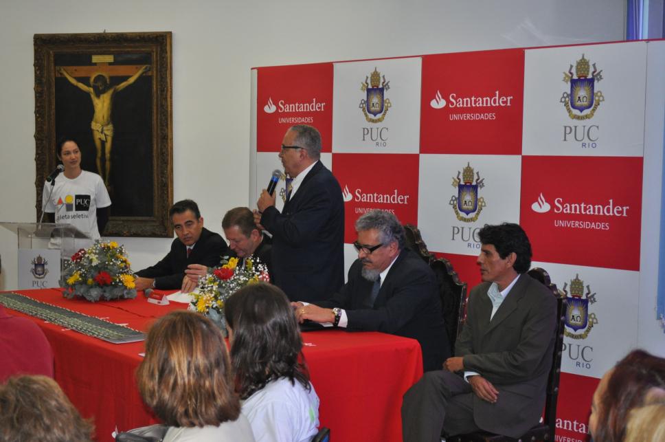 O reitor Padre Josafá fala na cerimônia de assinatura do convênio de apoio à Agenda Ambiental PUC-Rio e Santander Universidades. À mesa, além dos representantes da PUC-Rio, estão Jamil Hannouche, vice-presidente, e Afrânio Pereira, superintendete do Grupo Santander Universidades.