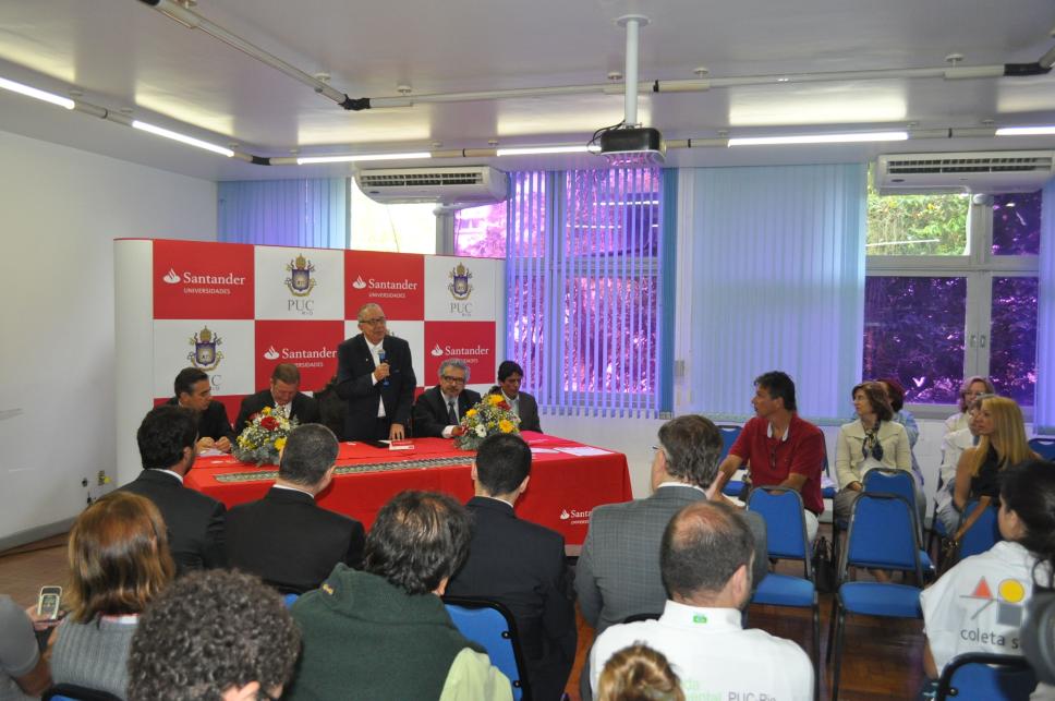 O reitor Padre Josafá fala na cerimônia de assinatura do convênio de apoio à Agenda Ambiental PUC-Rio e Santander Universidades. À mesa, além dos representantes da PUC-Rio, estão Jamil Hannouche, vice-presidente, e Afrânio Pereira, superintendete do Grupo Santander Universidades.