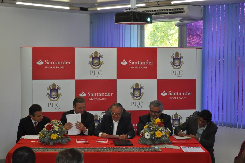 Os representantes da administração central da PUC-Rio e do Grupo Santander Universidades assinam o convênio de apoio à Agenda Ambiental.