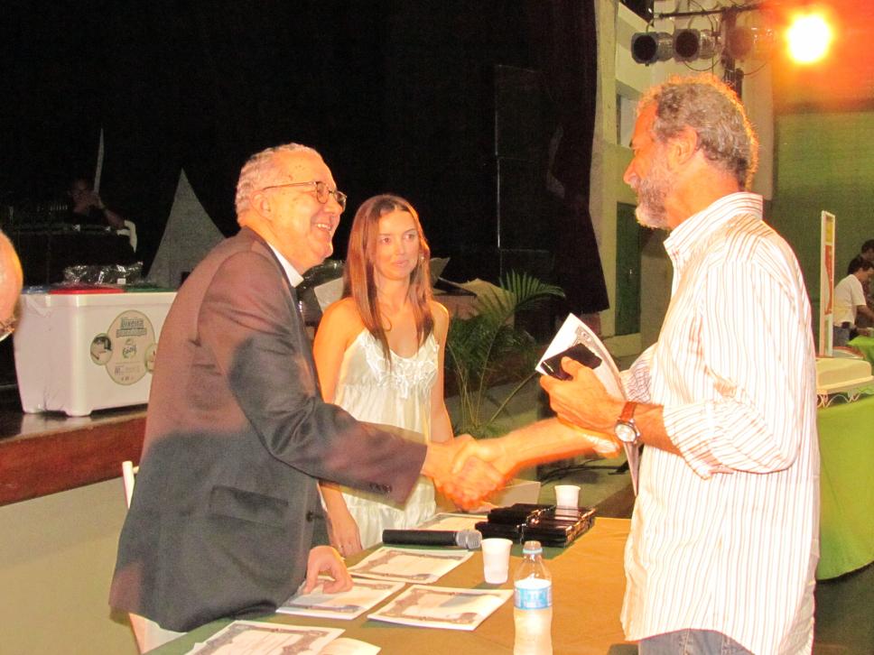 O Professor Jean Pierre Von Der Weid, do Centro de Telecomunicações da PUC-Rio, recebe, através do reitor Padre Josafá, o agradecimento de toda a universidade pelos quarenta anos de dedicação a ela.
