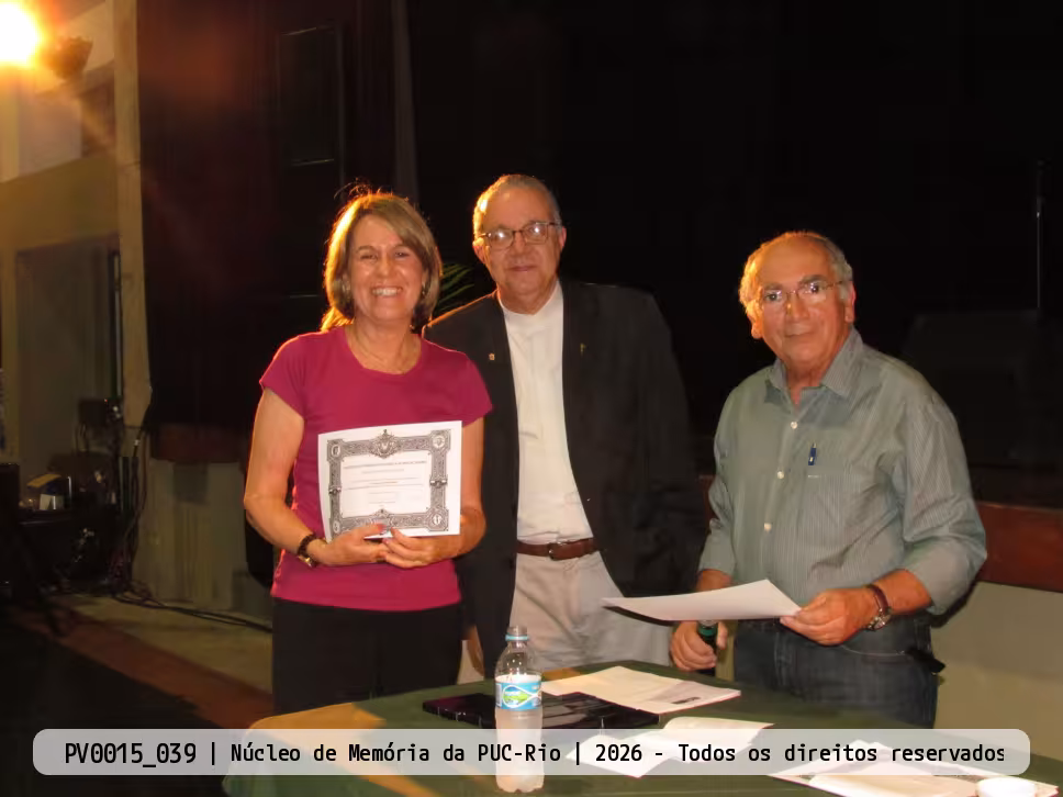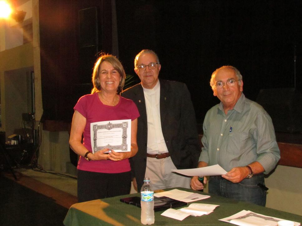O Reitor Pe. Josafá S.J. entrega o diploma e cumprimenta a profa. Maria Rita Passeri.