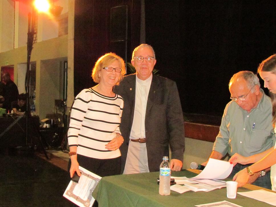 A profa. Piedade Grinberg recebe os cumprimentos do reitor pe. Josafá S.J. em agradecimento aos 25 anos de dedicação à PUC-Rio.
