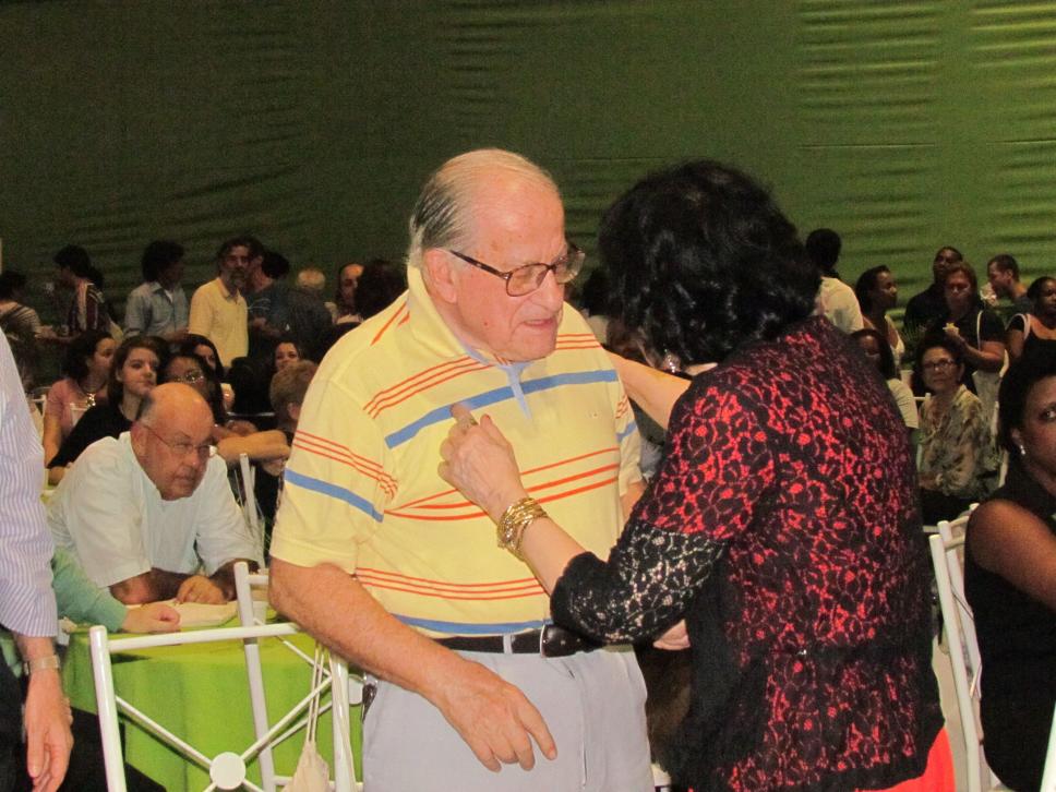 O ex-reitor Professor Padre Hortal e Alécia Moura, secretária da Reitoria, cumprimentam-se no evento que homenageou os professores e funcionários há mais tempo dedicados à PUC-Rio. Os dois foram homenageados na oportunidade.