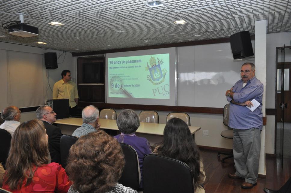 O Professor Miguel Serpa Pereira, do Departamento de Comunicação da PUC-Rio, e Pedro de Luna, programador visual da Agenda PUC-Rio, dão início ao evento de lançamento da TV PIXEL, inaugurada no ciclo de comemorações do septuagésimo aniversário da Universidade.