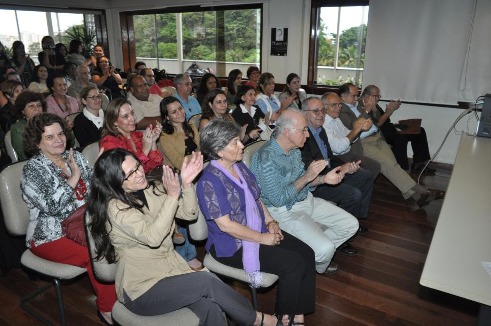 Alguns representantes da administração central, professores e funcionários da PUC-Rio acompanham o evento de lançamento da TV PIXEL, inaugurada no ciclo de comemorações do septuagésimo aniversário da Universidade.