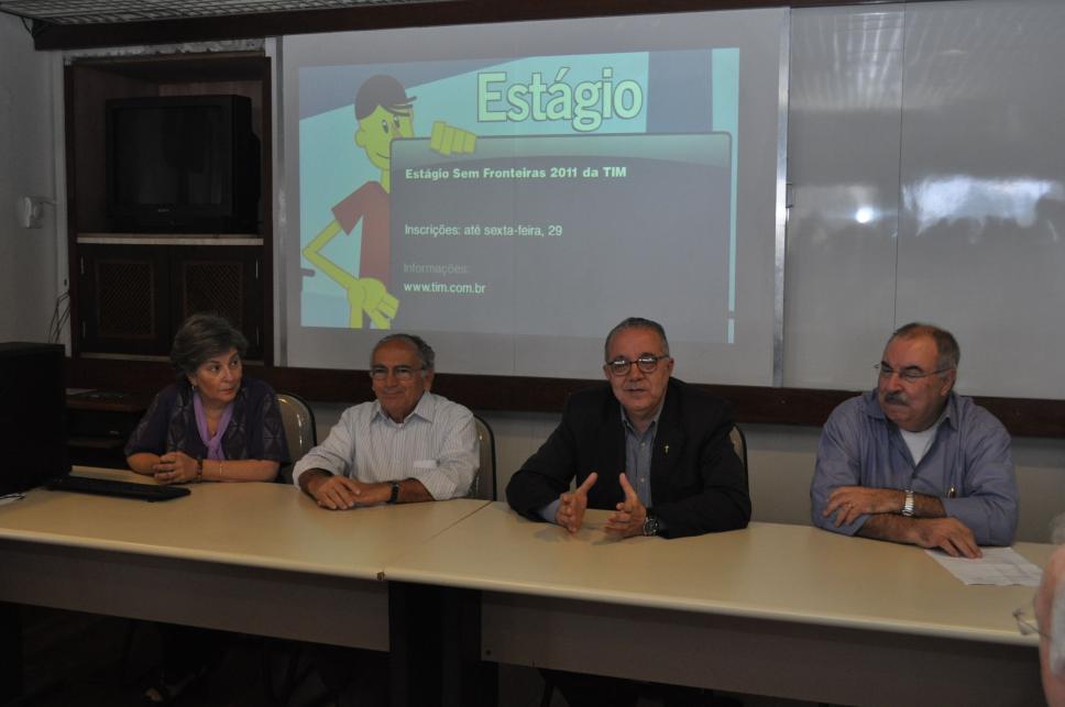 profa. Angeluccia Bernardes Habert (COM); vice-reitor comunitário prof. Augusto Luiz Duarte Lopes Sampaio (COM); reitor prof. pe. Josafá Carlos de Siqueira, S.J.; prof. Miguel Serpa Pereira (COM)