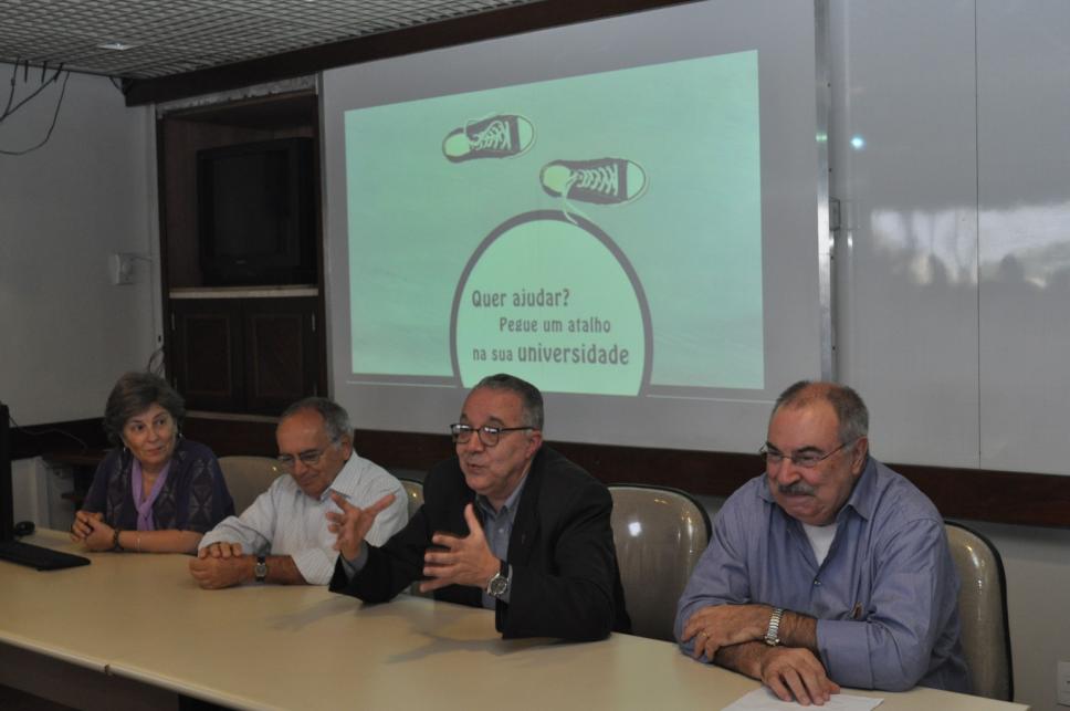 profa. Angeluccia Bernardes Habert (COM); vice-reitor comunitário prof. Augusto Luiz Duarte Lopes Sampaio (COM); reitor prof. pe. Josafá Carlos de Siqueira, S.J.; prof. Miguel Serpa Pereira (COM)