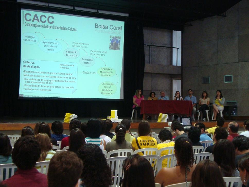 Suzana Mattos Kerber apresenta aos alunos no 'Meu Primeiro Dia na PUC' de 2011 a Coordenação de Atividades Comunitárias e Culturais. Em sua exposição, explica o processo de seleção para a Bolsa Coral, com seus critérios de avaliação e as etapas procedimentais.