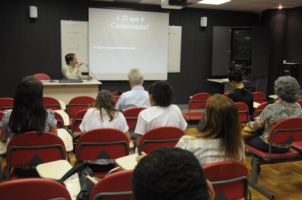 O Professor Erick Felinto, da UERJ, oferece a palestra 'Novos Espaços e Novas Formas de Representação (para a Epistemologia da Comunicação?)', no Seminário dos Alunos do Programa de Pós-Graduação em Comunicação Social da PUC-Rio (POSCOM VIII). A imagem registra o tema 'O que é comunicação?'