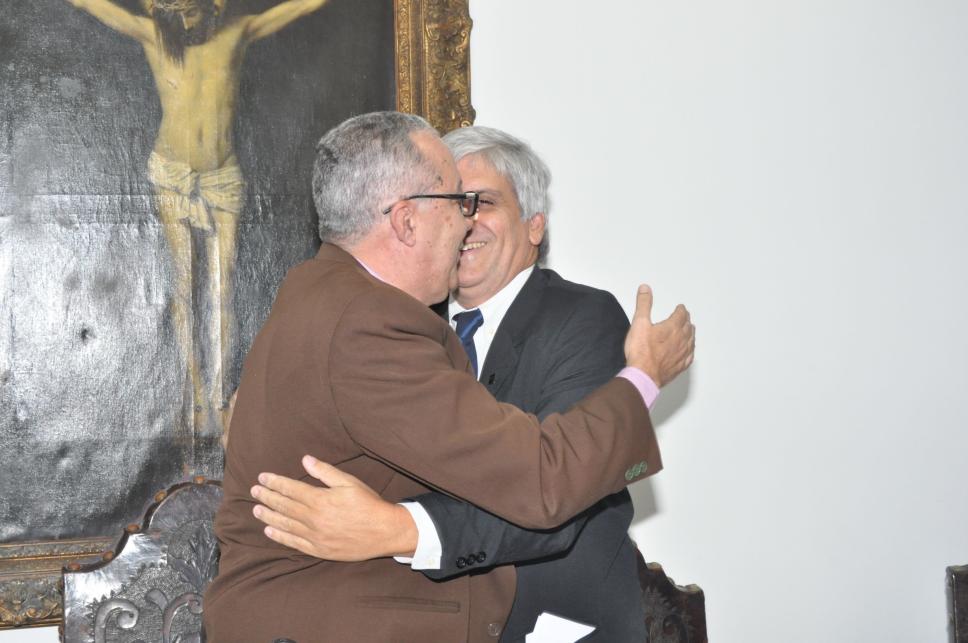 O reitor Padre Josafá abraça o Professor Alfredo Jefferson, substituído pela Professora Daniela Vargas na função de coordenador central de graduação.