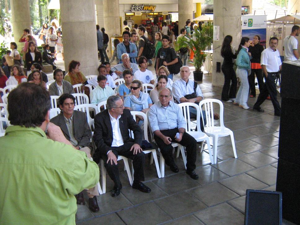 O reitor Padre Josafá, o vice-reitor comunitário Professor Augusto Sampaio e o Professor Luiz Felipe Guanaes Rego, diretor do NIMA, assistem às apresentações da jornada da XIV Semana do Meio-Ambiente, em junho de 2008.