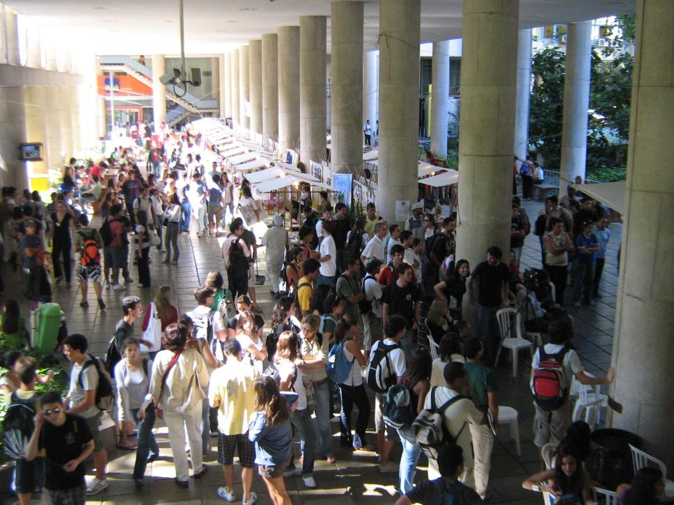 Professores, alunos e funcionários da PUC-Rio acompanham apresentação de conjunto de jovens nos pilotis, durante a XIV Semana do Meio-Ambiente, em junho de 2008