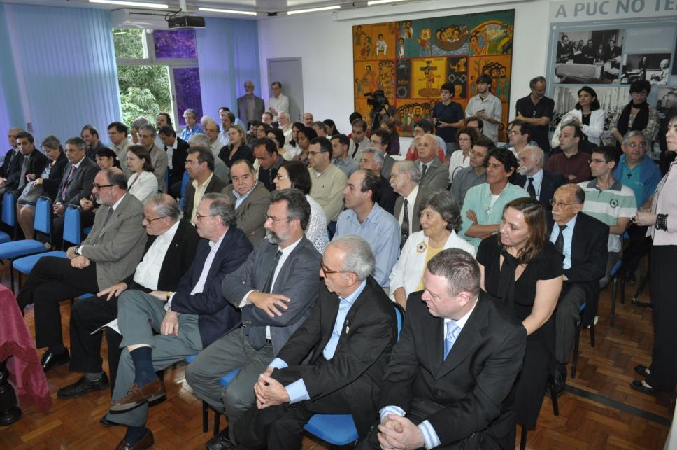 Professores, funcionários, alunos e representantes da administração central da PUC-Rio acompanham a cerimônia de posse do Professor Sérgio Bruni no cargo de Vice-reitor para Assuntos de Desenvolvimento.