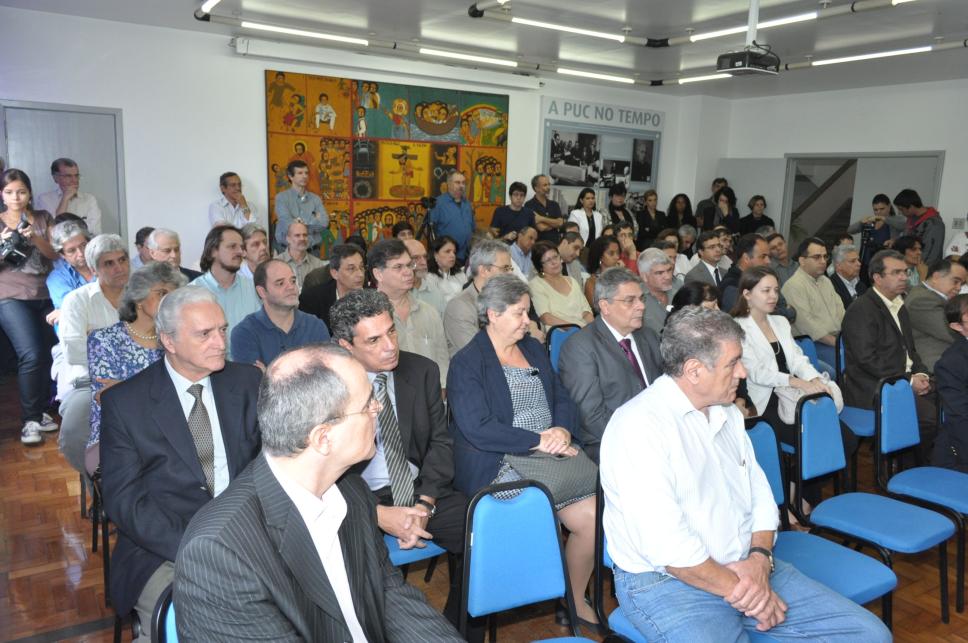Professores, funcionários, alunos e representantes da administração central da PUC-Rio acompanham a cerimônia de posse do Professor Sérgio Bruni no cargo de Vice-reitor para Assuntos de Desenvolvimento.