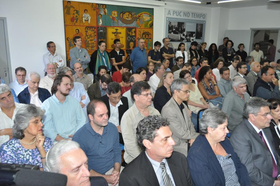 Professores, funcionários, alunos e representantes da administração central da PUC-Rio acompanham a cerimônia de posse do Professor Sérgio Bruni no cargo de Vice-reitor para Assuntos de Desenvolvimento.