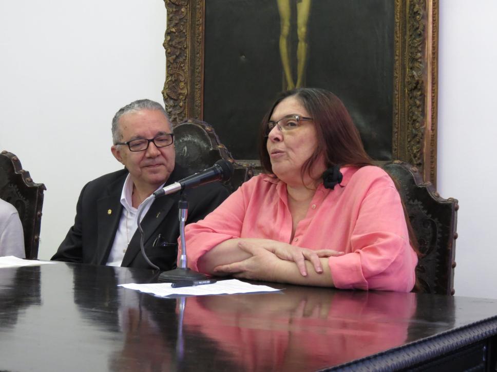 A Professora Irley Franco fala algumas palavras na cerimônia de transmissão do cargo de diretora do Departamento de Filosofia, que até então ela ocupava, à Professora Vera Cristina Bueno.