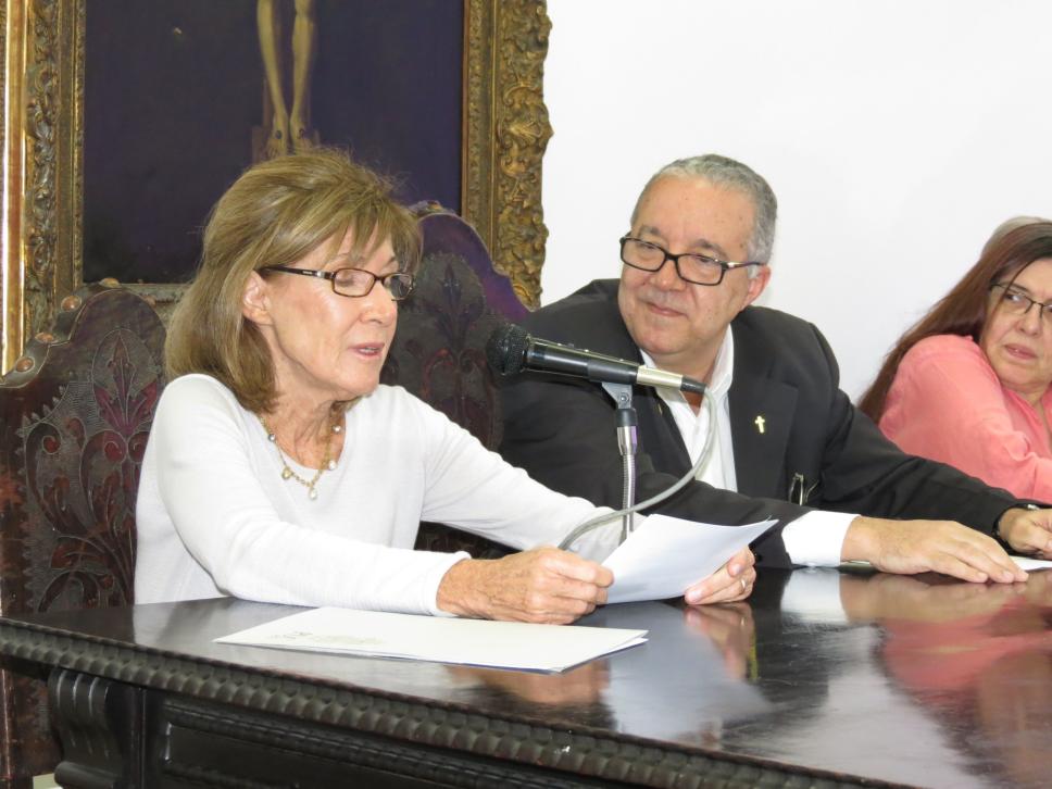 A Professora Vera Cristina Bueno discursa na cerimônia em que foi empossada no cargo de diretora do Departamento de Filosofia, substituindo a Professora Irley Franco, também presente à mesa.