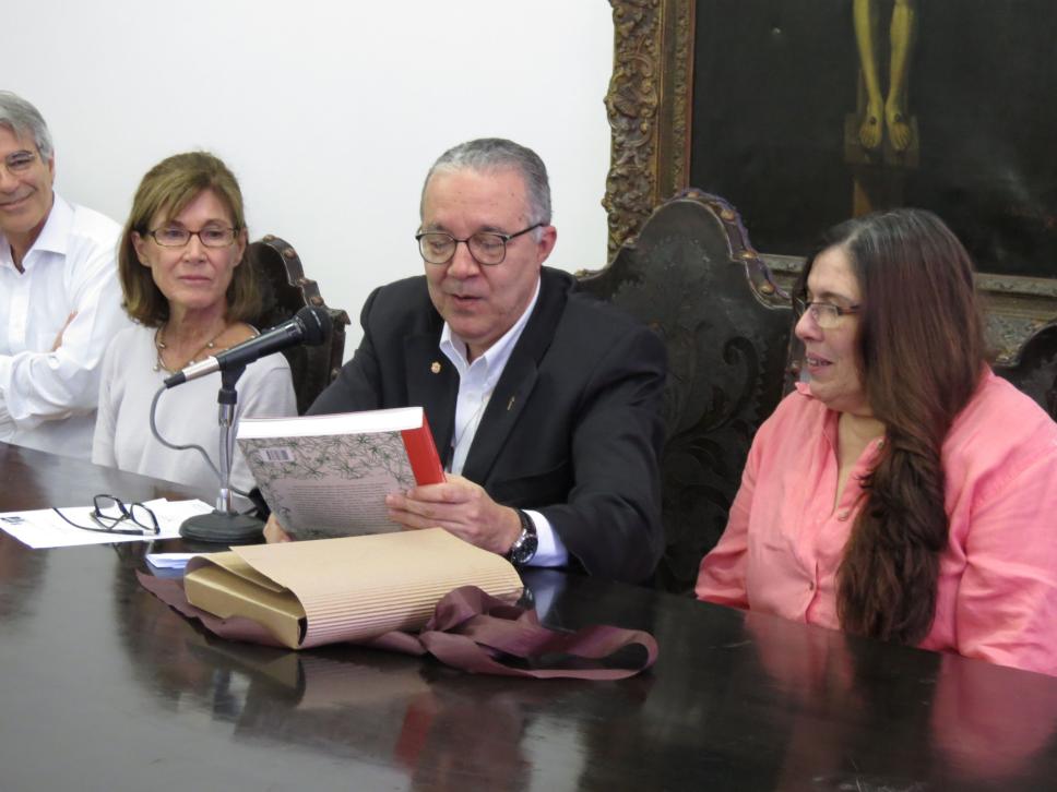 O reitor Padre Josafá encerra a cerimonia de posse da Professora Vera Cristina Bueno no cargo de diretora do Departamento de Filosofia, que até então era ocupado pela Professora Irley Franco, também presente à mesa.