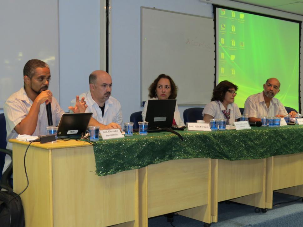 Seminário de Reflexão e Memória da Cultura Afrobrasileira', realizado na PUC-Rio em novembro de 2011. A imagem registra a mesa 'As ações afirmativas e a população negra no Brasil', coordenada e mediada pela Professora Andréia Clapp, do Departamento de Serviço Social, e formada pela Professora Ângela Paiva, do Departamento de Sociologia e Política, e pelos professores Alexandre do Nascimento, Amauri Mendes e João Feres Jr., de outras universidades.