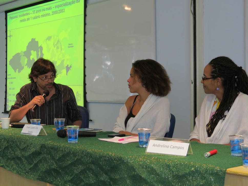 Seminário de Reflexão e Memória da Cultura Afrobrasileira', realizado na PUC-Rio em novembro de 2011. A imagem registra a mesa 'Territórios e territorialidades negras', coordenada e mediada pela Professora Ynaê Lopes dos Santos e formada pelos professores Maurício Arruti, do Departamento de Educação, Job Eloísio, do Departemento de Direito, e Adrelino Campos.