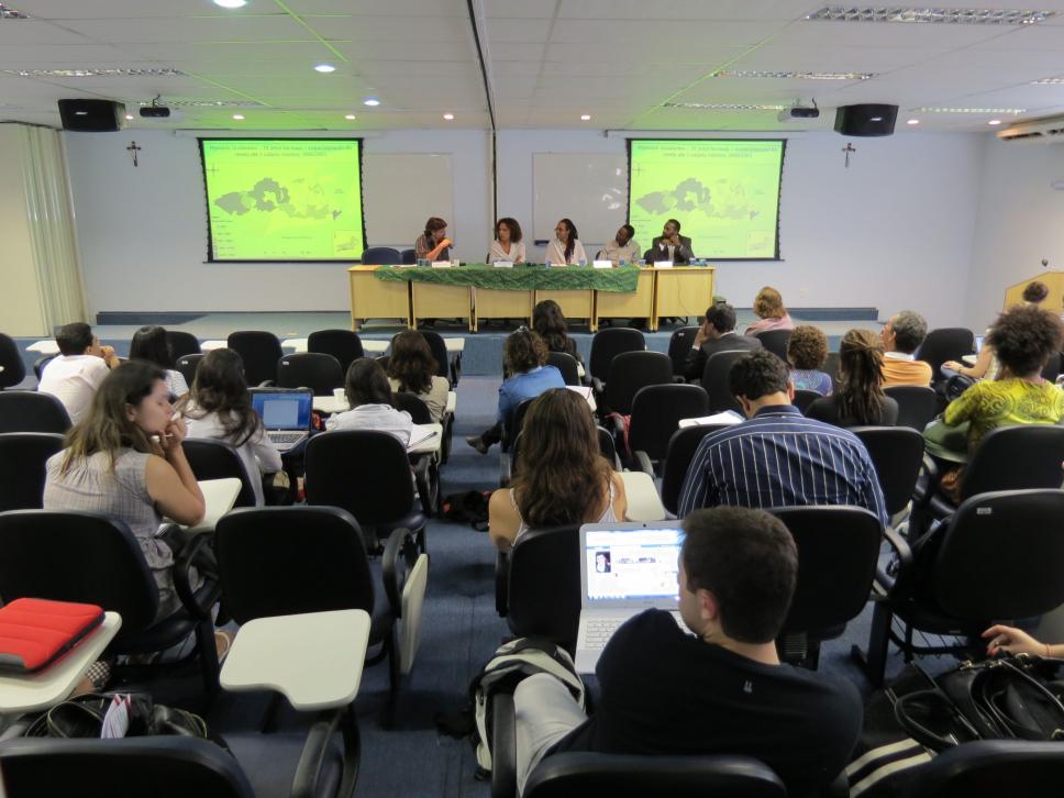 Seminário de Reflexão e Memória da Cultura Afrobrasileira', realizado na PUC-Rio em novembro de 2011. A imagem registra a mesa 'Territórios e territorialidades negras', coordenada e mediada pela Professora Ynaê Lopes dos Santos e formada pelos professores Maurício Arruti, do Departamento de Educação, Job Eloísio, do Departemento de Direito, e Adrelino Campos.