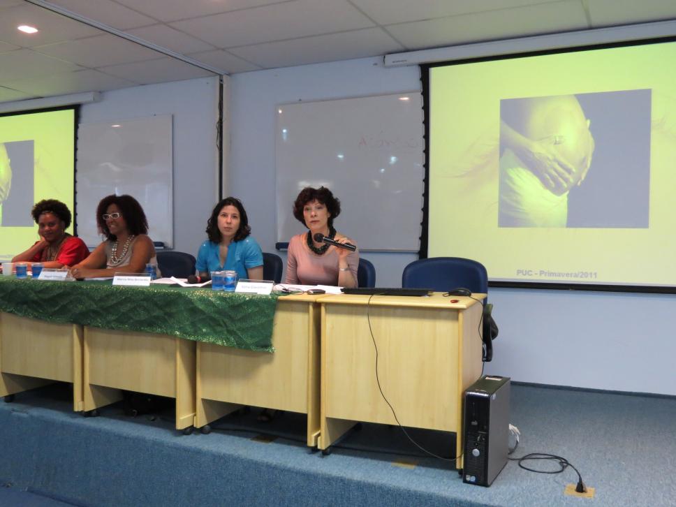 Seminário de Reflexão e Memória da Cultura Afrobrasileira', realizado na PUC-Rio em novembro de 2011. A imagem registra a mesa 'Gênero, Raça e Sexualidade', coordenada e mediada pela Professora Márcia Nina Bernardes, do Departamento de Direito da PUC-Rio, e formada pelos professores Sonia Giacomini, do Departamento de Sociologia e Política da universidade, Magali Almeida, da UERJ, e Joilson Santana, da SEASDH, e ainda pela representante da Aqualtune, Sheila Dias.