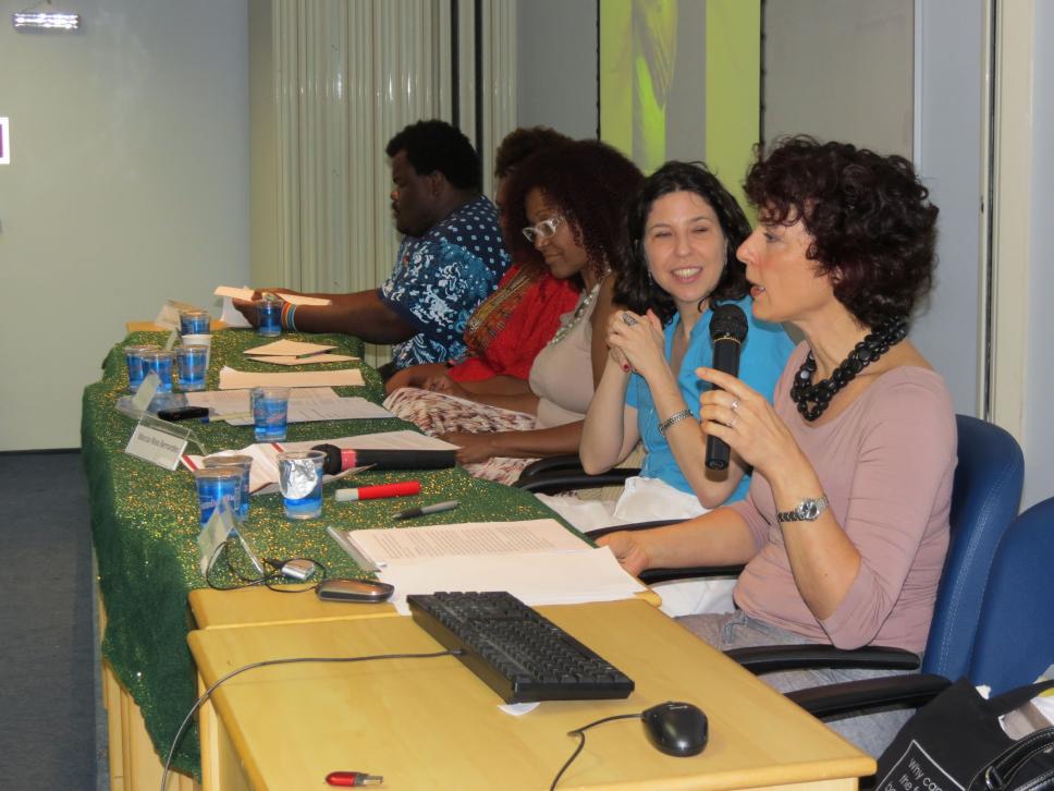 Seminário de Reflexão e Memória da Cultura Afrobrasileira', realizado na PUC-Rio em novembro de 2011. A imagem registra a mesa 'Gênero, Raça e Sexualidade', coordenada e mediada pela Professora Márcia Nina Bernardes, do Departamento de Direito da PUC-Rio, e formada pelos professores Sonia Giacomini, do Departamento de Sociologia e Política da universidade, Magali Almeida, da UERJ, e Joilson Santana, da SEASDH, e ainda pela representante da Aqualtune, Sheila Dias.