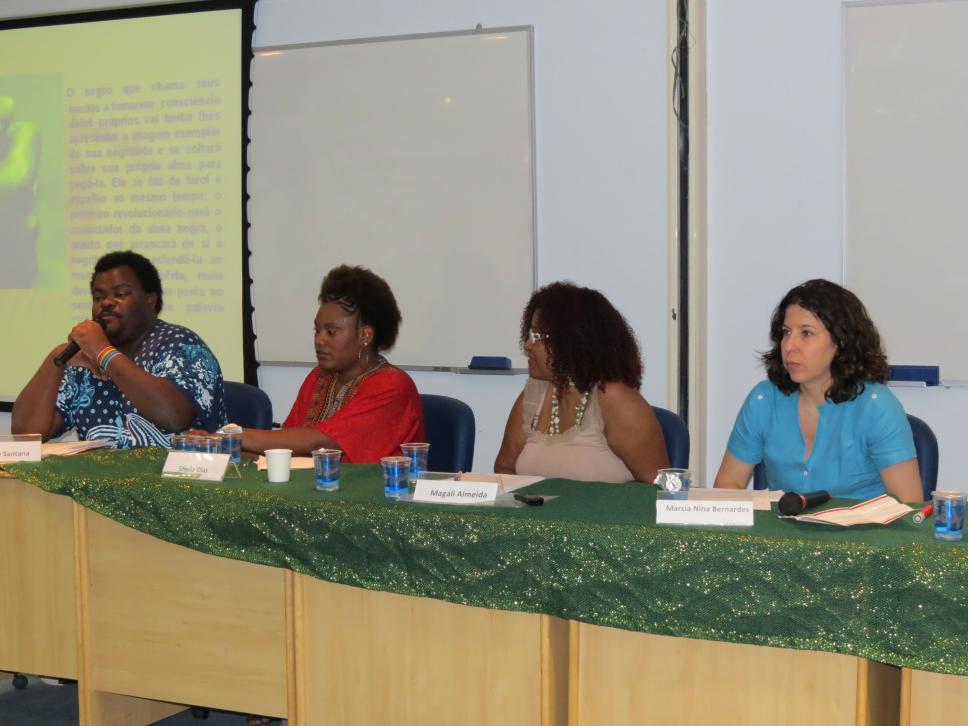 Seminário de Reflexão e Memória da Cultura Afrobrasileira', realizado na PUC-Rio em novembro de 2011. A imagem registra a mesa 'Gênero, Raça e Sexualidade', coordenada e mediada pela Professora Márcia Nina Bernardes, do Departamento de Direito da PUC-Rio, e formada pelos professores Sonia Giacomini, do Departamento de Sociologia e Política da universidade, Magali Almeida, da UERJ, e Joilson Santana, da SEASDH, e ainda pela representante da Aqualtune, Sheila Dias.