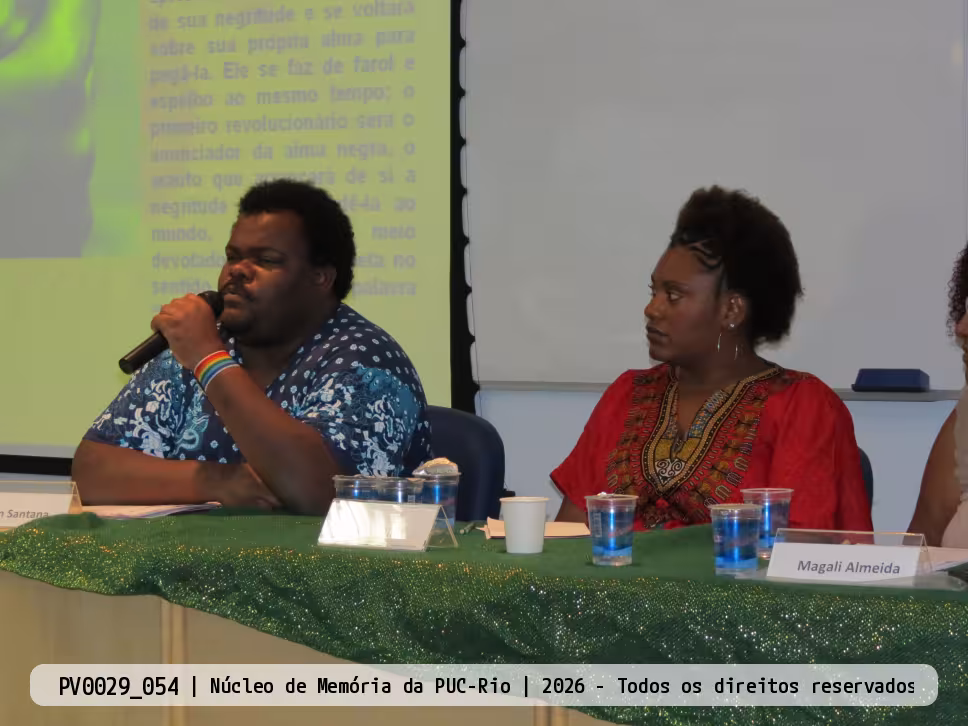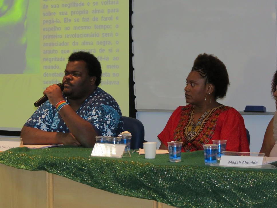 Seminário de Reflexão e Memória da Cultura Afrobrasileira', realizado na PUC-Rio em novembro de 2011. A imagem registra a mesa 'Gênero, Raça e Sexualidade', coordenada e mediada pela Professora Márcia Nina Bernardes, do Departamento de Direito da PUC-Rio, e formada pelos professores Sonia Giacomini, do Departamento de Sociologia e Política da universidade, Magali Almeida, da UERJ, e Joilson Santana, da SEASDH, e ainda pela representante da Aqualtune, Sheila Dias.