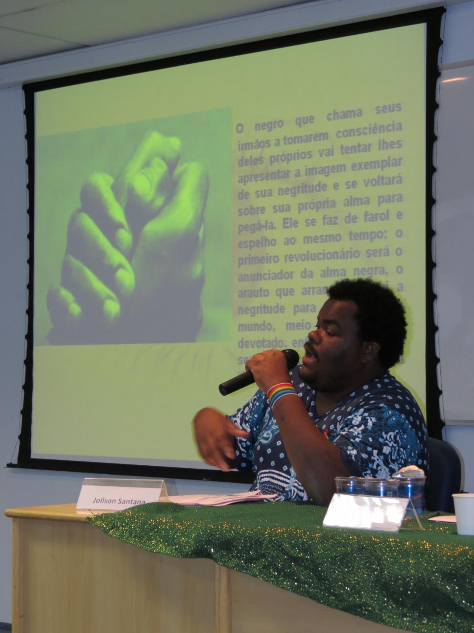 Seminário de Reflexão e Memória da Cultura Afrobrasileira', realizado na PUC-Rio em novembro de 2011. A imagem registra a mesa 'Gênero, Raça e Sexualidade', coordenada e mediada pela Professora Márcia Nina Bernardes, do Departamento de Direito da PUC-Rio, e formada pelos professores Sonia Giacomini, do Departamento de Sociologia e Política da universidade, Magali Almeida, da UERJ, e Joilson Santana, da SEASDH, e ainda pela representante da Aqualtune, Sheila Dias.