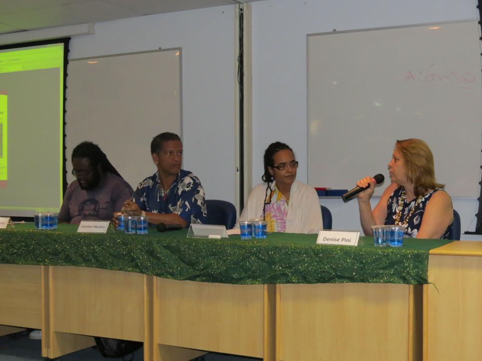 Seminário de Reflexão e Memória da Cultura Afrobrasileira', realizado na PUC-Rio em novembro de 2011. A imagem registra a mesa 'Religiosidade Afrobrasileira e Liberdade Religiosa', coordenada e mediada pela Professora Denise Pini, do Departamento de Serviço Social da PUC-Rio, e formada por André Guimarães e Adailton Moreira.