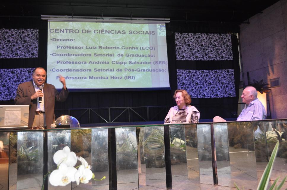 decano prof. Luiz Roberto de Azevedo Cunha (ECO - CCS); profa. Andréia Clapp Salvador (SER); prof. César Romero Jacob (COM)