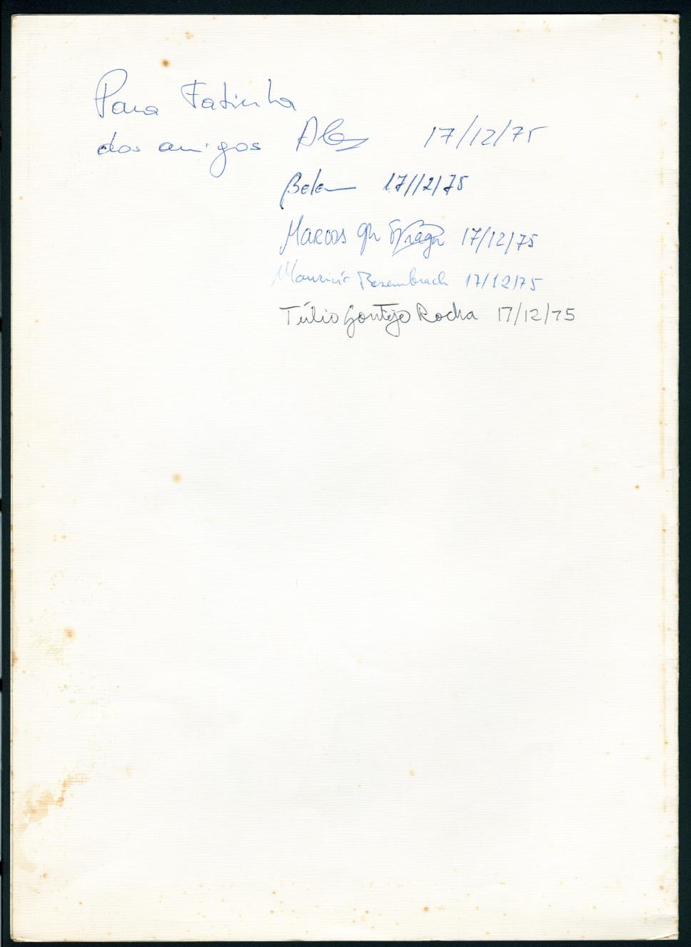 Alguns formandos da turma de Engenharia Elétrica de dezembro de 1975 assinaram a contracapa do convite de formatura para a funcionária Maria de Fátima de Castro Dinoá, secretária do Departamento de Engenharia Civil.