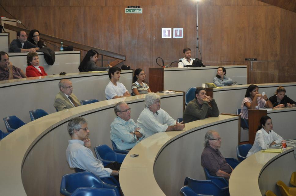 A plateia no auditório do RDC acompanha a abertura da jornada da XVII Semana do Meio-Ambiente na PUC-Rio. Palestra com o Vice-reitor de Desenvolvimento, prof. Sérgio Bruni, e os professores Luiz Felipe Guanaes Rego e Fernando Walcacer, diretor e vice-diretor do NIMA