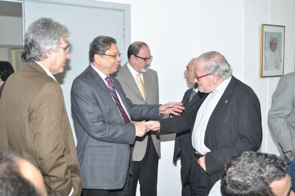 Visita do Núncio Apostólico no Brasil, Dom Lorenzo Baldisseri, à PUC-Rio, para lançamento de seu livro 'Diplomacia Pontifícia - Acordo Brasil-Santa Sé - Intervenções'. Na imagem, representantes da administração central e outros professores da PUC-Rio cumprimentam-se antes do evento.