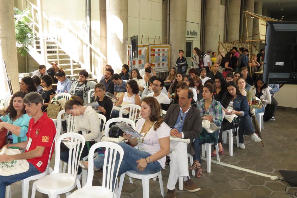 Do lado de fora do Auditório Anchieta, a plateia acompanha a abertura do evento.