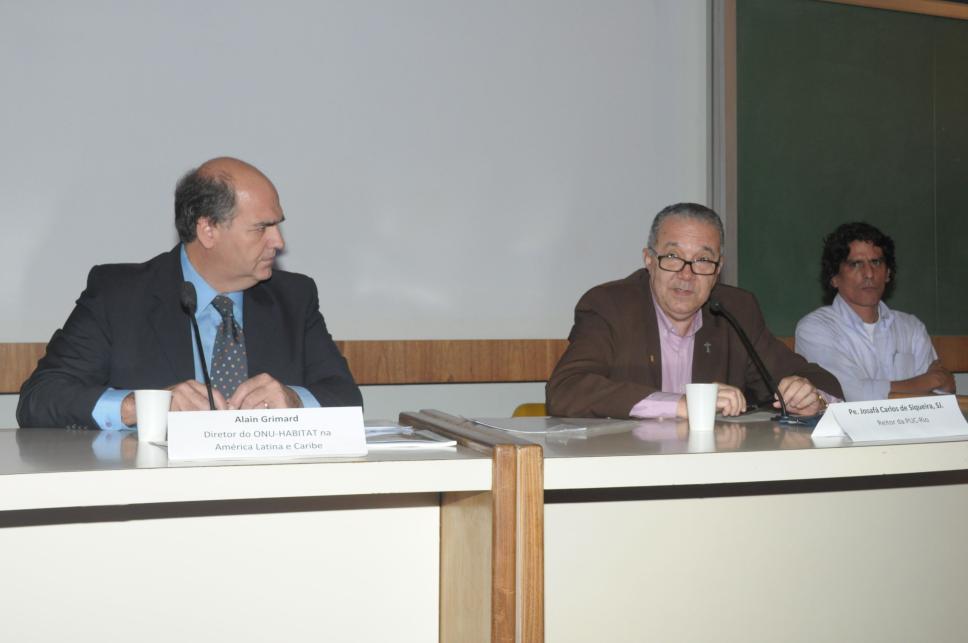 A PUC-Rio foi designada para celebrar o Dia Mundial do Habitat de 2011 no Rio de Janeiro. Na imagem, aparece o debate Cidades e Mudanças Climáticas, parte da Celebração Global que compunha o evento. Na mesa, estão Alain Grimard, diretor da ONU HABITAT na América Latina e Caribe, o reitor Padre Josafá e o diretor do NIMA, Professor Luiz Felipe Guanaes Rego.